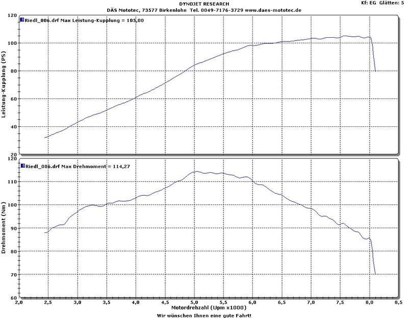 Ich hatte den DÄS Kit BOS-Auspuff, PCV und offenen Luftfilterdeckel bis letzten Herbst verbaut und habe es nicht bereut. Der Auspuff hat einen schönen dumpfen Klang und du spürst kein Drehmomentloch mehr. Hier das Diagramm nach dem Umbau, gemessen an der Kupplung. ![]() Da ich aber noch ein bisschen mehr Leistung und Drehmoment haben wollte, habe ich einen Stuhlmüller F1 Kit mit Rexxermapping verbauen lassen. Der Unterschied zum DÄS Kit, der Motor läuft sehr weich und das Ansprechverhalten ist sehr direkt. Der Hammer ist die Beschleunigung und das sehr schnelle hochdrehen des Motors, ein riesen Unterschied zu vorher. Aber der Umbau kostet halt auch entsprechend ! Leistungsdiagramm F1 Kit, gemessen am Hinterrad. ![]() Signatur Lieber lieber Guzzi-Gott, bitte halt die Guzzi flott, schenk mir Kurven jeden Tag und alles was ich sonst noch mag! | ||||